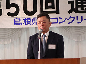 「島根県生コンクリート工業組合は組合員40社46工場で昭和50年に設立認可され、本年創立50周年を迎えた。50周年を迎えることができたのも、業界の発展に格別のご尽力をいただいた方々やご来賓の皆様方のご支援のお陰である。「次の50年」を目指し、地域のインフラ整備や頻発化・激甚化する自然災害対応に、なくてはならない建設基礎資材の安定供給という社会的責任を果たすため、品質の更なる向上や需要開拓などたゆまぬ精進を重ねていく。一層のご指導、ご鞭撻をお願い申し上げる。」と述べられた。