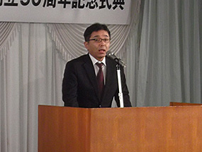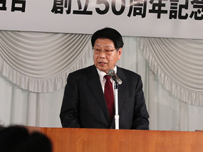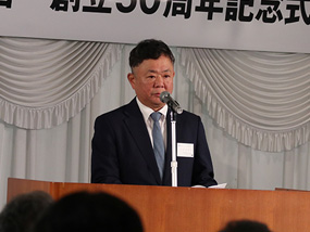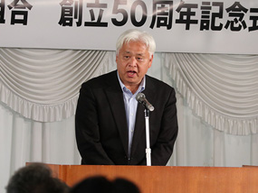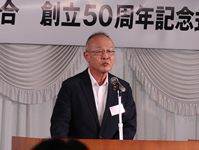 続いて、全国生コンクリート工業組合連合会 斎藤昇一会長代理の木康夫常務理事から祝辞をいただいた。「昭和50年は景気後退で業界は大変混乱していた時代であった。困難な状況の中で設立し以来50年にわたり事業を継続してきたことは、歴代の役職員、組合員が協調を第一とし一致団結して運営されてきた賜物である。また、農道などの簡易舗装のコンクリート舗装の提案などは他の組合の参考になる。全生連として取り組んでいる5つの重点項目(生コンの品質向上、需要の確保、人材確保のためのイメージアップ、適正価格の実現と契約形態の改善、カーボンニュートラルへの対応)の解決のために各組合と連携しながら取り組んでいく。」と述べられた。
