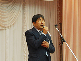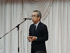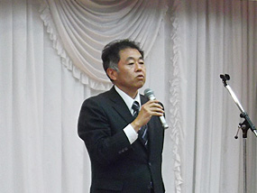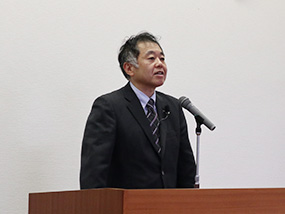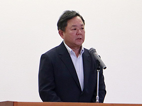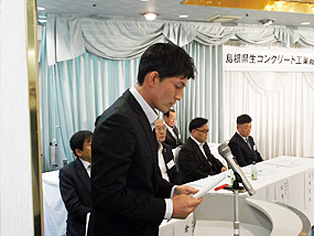 続いて、浜田河川国道事務所 徳光優所長代理の庄司彰副所長から祝辞をいただいた。「3月に山陰道の出雲から出雲多伎区間が開通し、また三隅益田道路は工事の最盛期を迎えており、コンクリートの安定供給に協力いただいている。品質確保にたゆまない努力をしていることに敬意を申し上げる。」と述べられた。