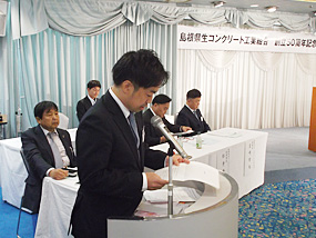 その後、来賓として国土交通大臣政務官 高見康裕衆議院議員代理の曽田昇秘書から祝辞をいただいた。「生コンクリート産業は最も重要で大切な基幹産業であると確信している。厳しい経済状況が続いているが一丸となり打開できるように取り組んでいく。」と述べられた。