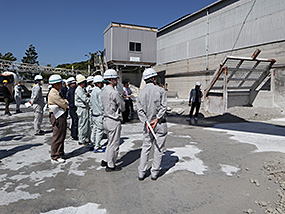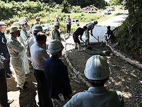 雲南共同生コン生産会社が開発した「循環型コンクリート」によるコンクリート舗装工事の工場及び現場での見学会を開催した。