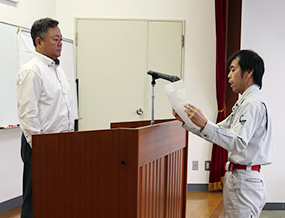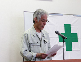 組合員を代表して、矢田試験係長が「国土開発の基礎資材産業人としての誇りを持ち、豊かな社会の創造と社会的使命の達成に努めている私たち生コン産業にとって、安全と健康の確保は最優先の課題である。人命尊重を基本理念とし、一人一人が関係法規とルールを順守し組織ぐるみで安全衛生活動を展開しなければならない。本日の労働交通安全大会を契機に、労働災害ゼロの決意を新たにし、安全で快適な職場づくりに努める。」と力強く宣言した。